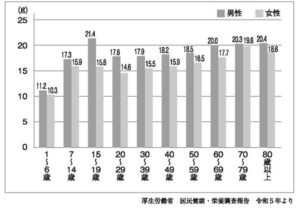 - 日本人の年代別食物繊維摂取量(g)