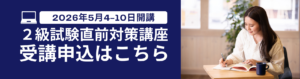 | 対策講座日程 | 2級 2026年5月4日(月)~10日(日) 1級 2026年8月3日(月)~9日(日) ※期間内の任意の時間に講座動画をご視聴いただきます。(動画時間約2時間) |